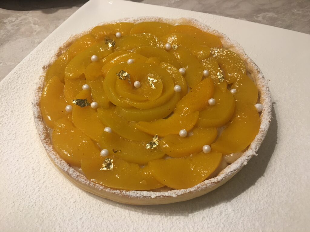 Une tarte raffinée, mariant la douceur fruitée des pêches à l’onctuosité de la crème pâtissière, le tout sublimé par une présentation en rosace digne des grandes pâtisseries.