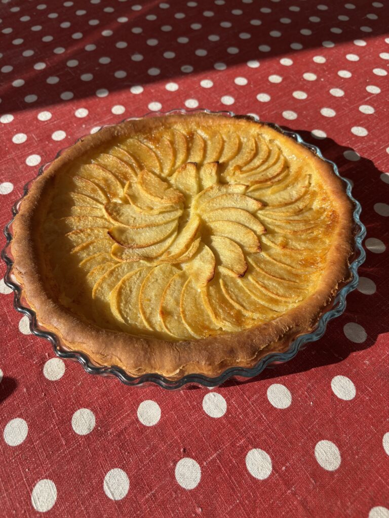 Une tarte aux pommes comme on les aime : une pâte levée moelleuse, une garniture fondante au beurre, sucre et œuf, et de fines lamelles de pommes disposées en rosace. À la cuisson, tout se marie pour donner une tarte dorée, brillante et parfumée, qui se savoure aussi bien tiède que froide.