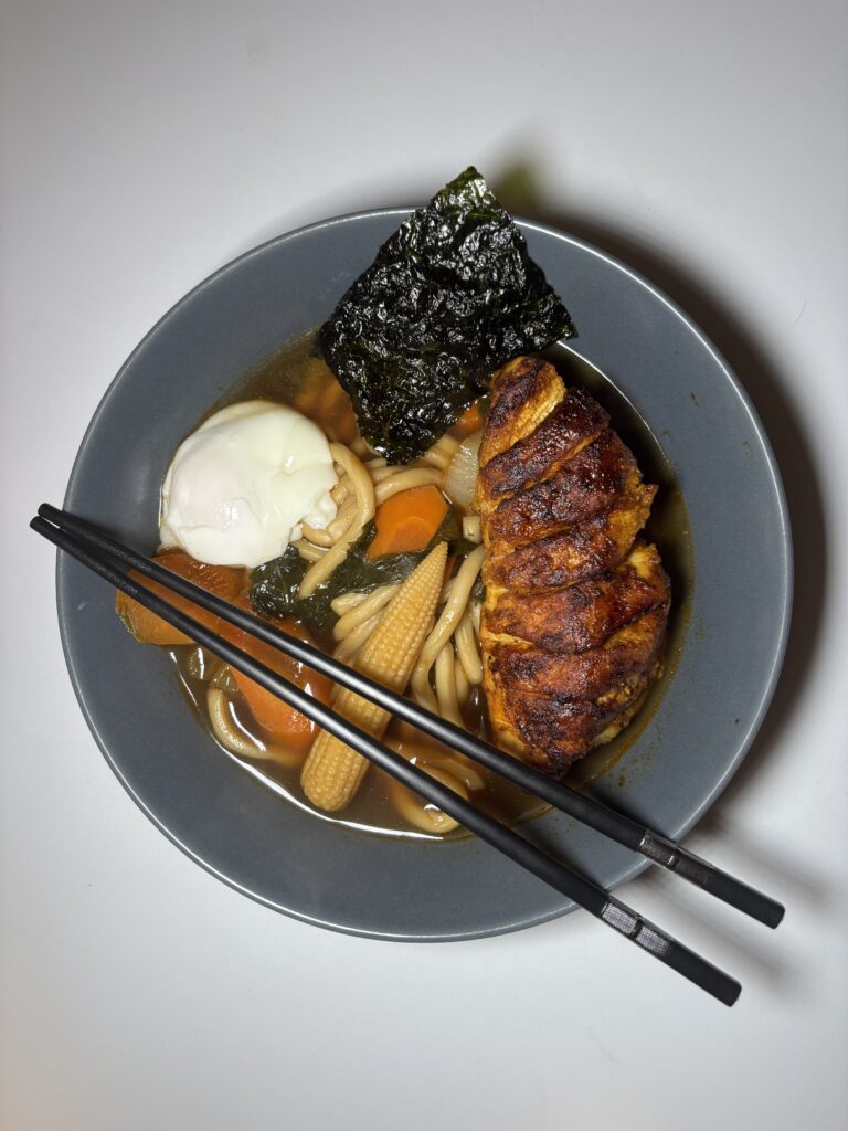 Dans un grand bol, commencez par disposer les nouilles et les légumes. Ajoutez ensuite le bouillon brûlant. Déposez délicatement un œuf, puis disposez le blanc de poulet tranché. Pour terminer, placez une feuille de nori sur le bord du bol et servez immédiatement.