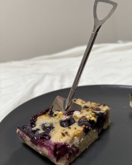 Carré de clafoutis banane, mûres et myrtilles, servi avec une cuillère en forme de pelle