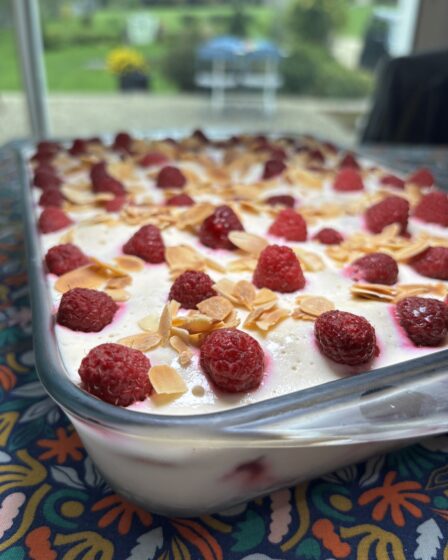 Tiramisu aux framboises présenté dans un grand plat en verre, décoré de framboises fraîches et d’amandes effilées dorées.