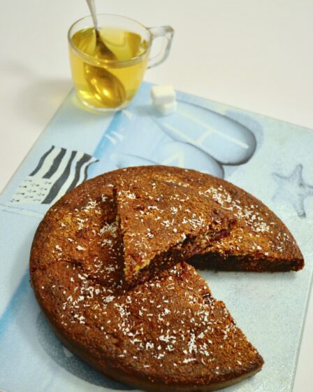 Part de gâteau au yaourt marbré cacao et framboises, saupoudrée de noix de coco.