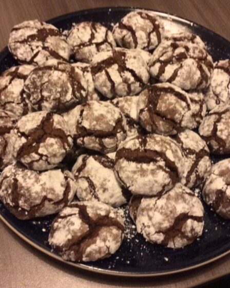 Crinkles au chocolat craquelés, saupoudrés de sucre glace sur une plaque de cuisson.