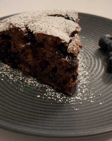 Part de gâteau moelleux aux myrtilles et chocolat, saupoudrée de sucre glace.