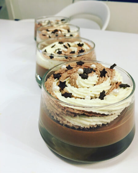 Verrines de panna cotta au chocolat surmontées d’une chantilly vanille-cacao bicolore.