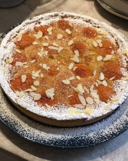 Tarte amandine aux abricots dorée, décorée d’amandes effilées.