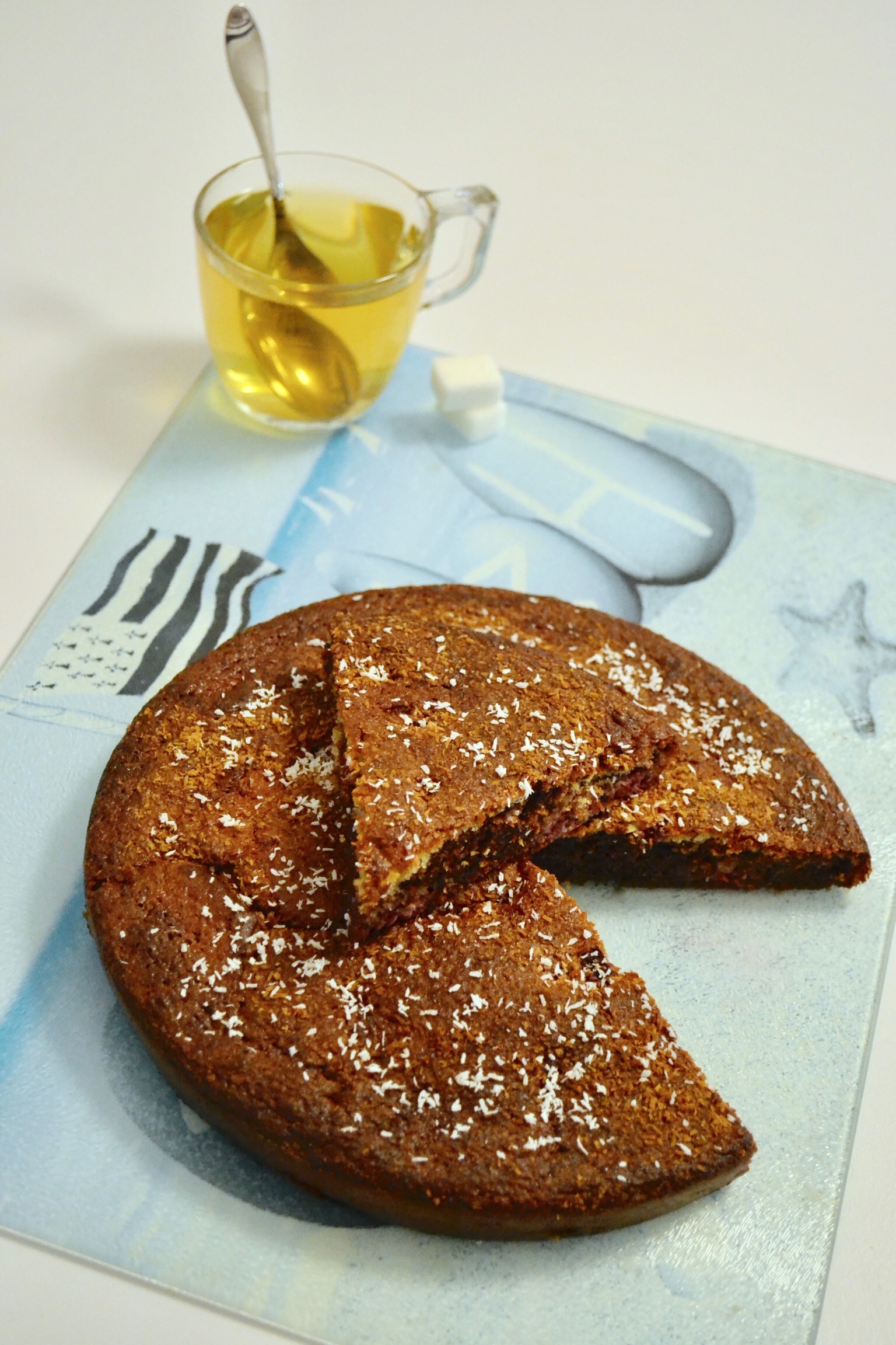 Part de gâteau au yaourt marbré cacao et framboises, saupoudrée de noix de coco.